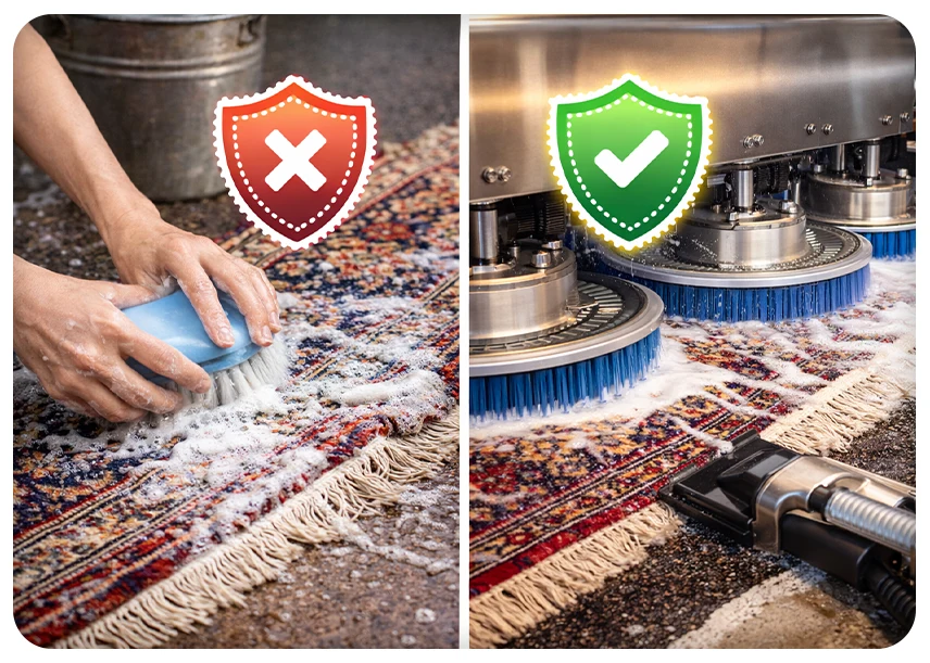 در گذشته، شستشوی فرش به‌صورت دستی و با ابزارهای ساده‌ای مانند برس، چوب و آب فراوان انجام می‌شد. این روش‌های سنتی در عمل مشکلات زیادی برای بافت و ریشه فرش ایجاد می‌کردند. نبود کنترل بر فشار آب، استفاده از شوینده‌های غیراستاندارد، تماس مستقیم ریشه با مواد قلیایی و فشار دست کارگر، باعث می‌شد فرش به مرور زمان رنگ و درخشش خود را از دست بدهد و ریشه‌ها دچار پارگی یا پوسیدگی شوند.